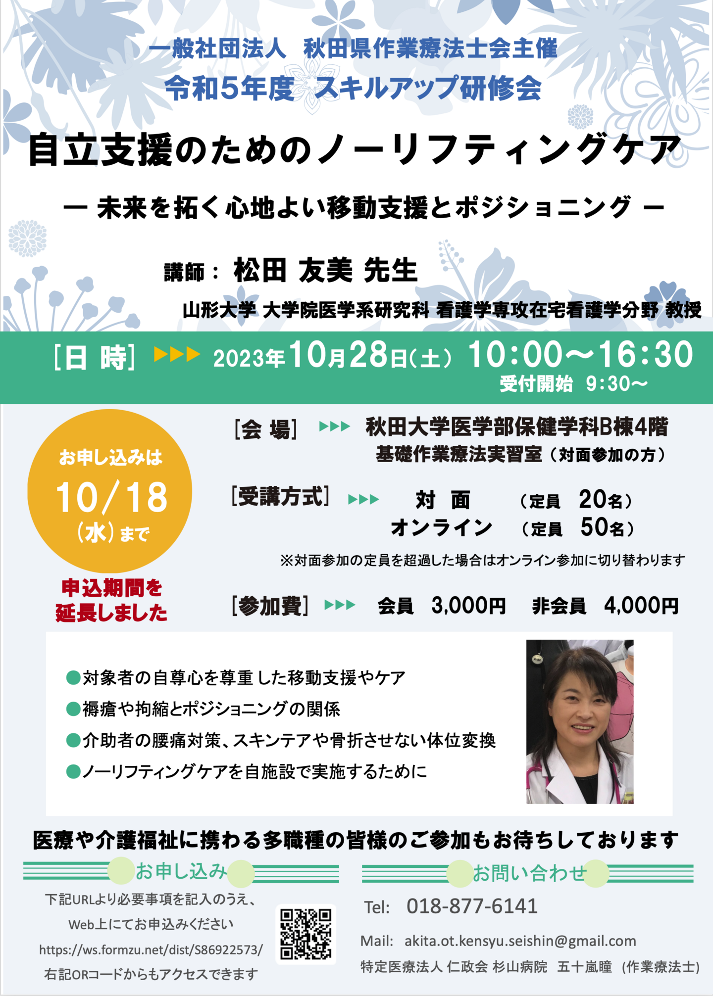 10月28日(土)に開催されます、スキルアップ研修会「自立支援のためのノーリフティングケア ― 未来を拓く心地よい移動支援とポジショニング −」は申し込み締め切りを10月18日まで延長いたしました。対面参加、オンライン参加ともにまだ申込可能です。(10月9日現在)