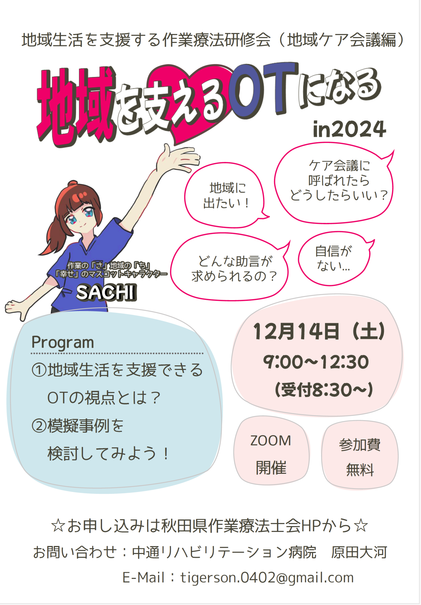 秋田県作業療法士会においても、2016年度から行っている地域支援事業に資する人材育成を継続しながら、地域に根ざした人と人、人と社会のつながりを、会員各位とともに1歩ずつ各市町村単位において創り出してまいりました。現状で地域に関わりの少ない会員の方も、お気軽にご参加いただき、いま地域で起こっていること、期待されることを知る機会になれば幸いです。